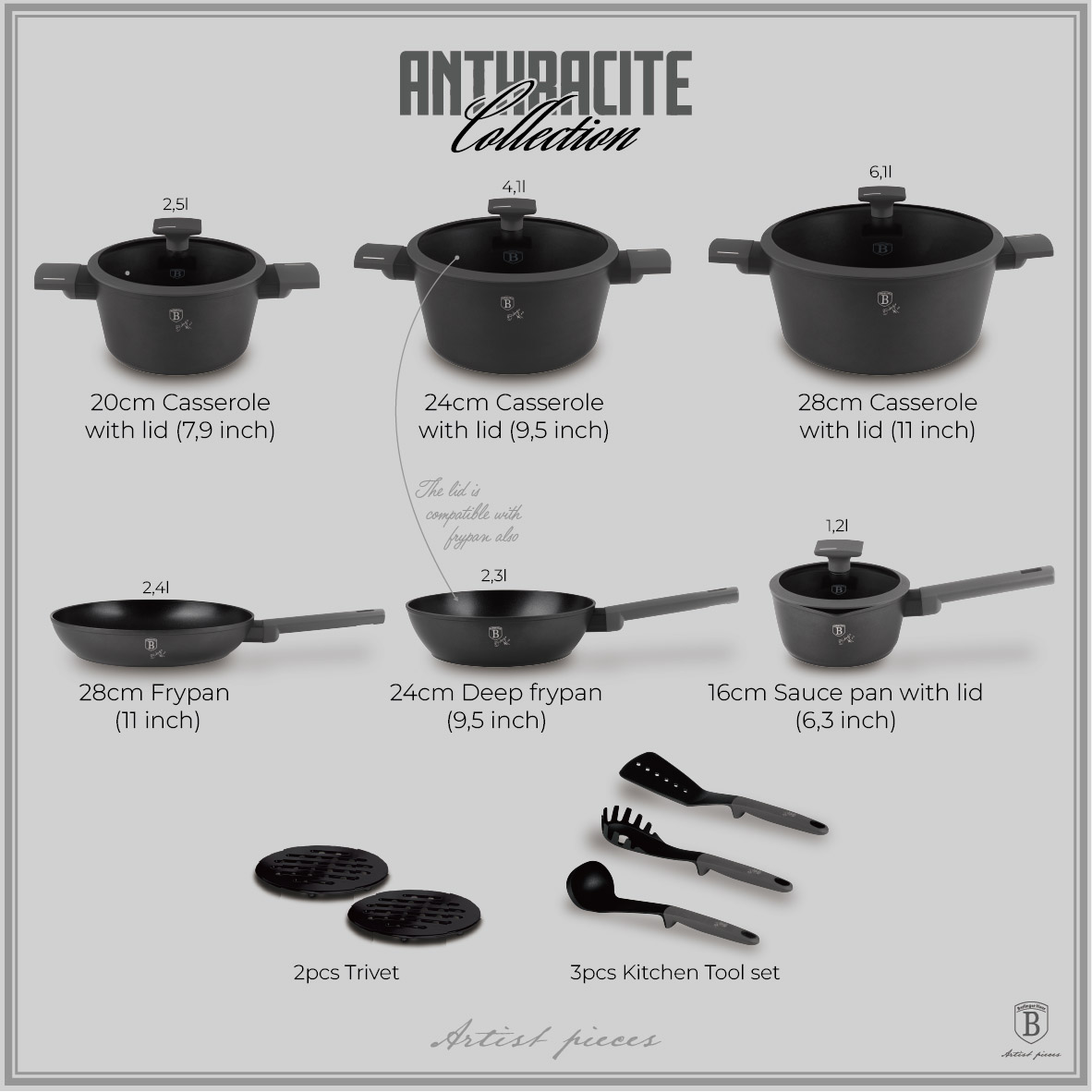 A 15 részes edénykészlet az Antracit Collection része, amely a modern konyhák elengedhetetlen kelléke. Ez a kollekció nemcsak funkcionális, hanem esztétikailag is lenyűgöző, így a konyhai eszközök nem rejtőznek el a fiókok mélyén, hanem büszkén kiállíthatók.
