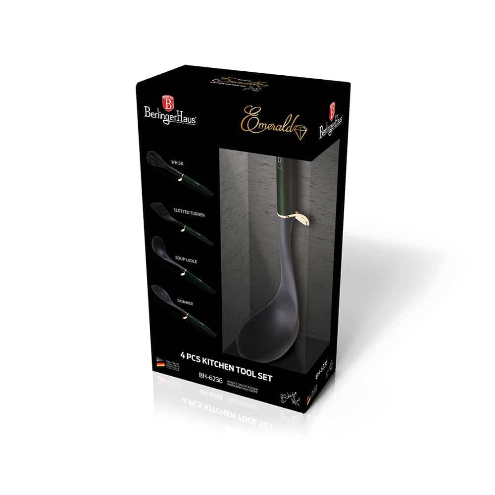 A 4 részes konyhai eszközkészlet, smaragdzöld-fekete színben, az Emerald Collection része, amely a konyhai eszközök új szintjét képviseli. Ez a kollekció nemcsak funkcionális, hanem stílusos is, így minden konyhában megállja a helyét. A készlet tartalmaz egy fordítólapátot, habverőt, fölözőkanalat és merőkanalat, mindezt elegáns smaragdzöld és arany színekben.