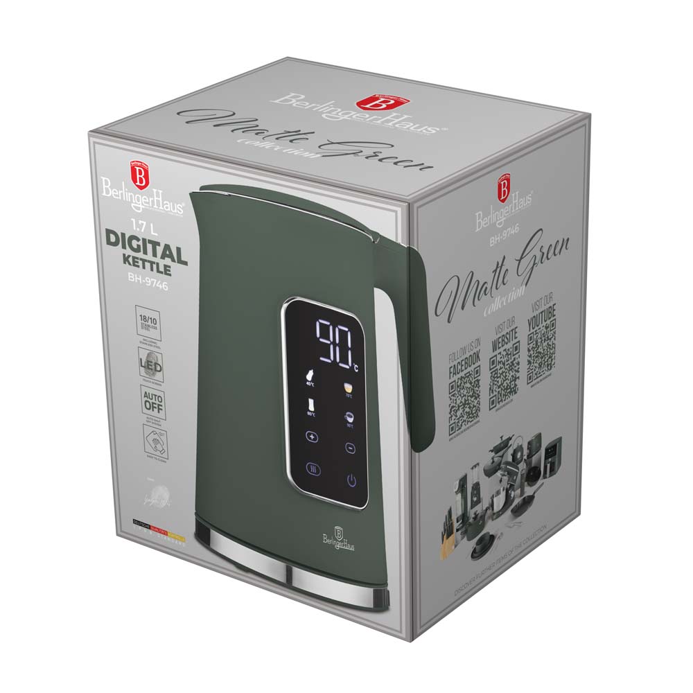 A Digitális elektromos vízforraló (2200 W) a Matte Green Collection része, amely nemcsak a funkcionalitásával, hanem a stílusával is lenyűgöz. Ez a vízforraló tökéletes választás azok számára, akik szeretik a modern, mégis elegáns konyhai eszközöket. A kollekció minden darabja harmonizál egymással, így bátran kihelyezhetők a konyhapultra, nem kell őket a fiók mélyére rejteni.