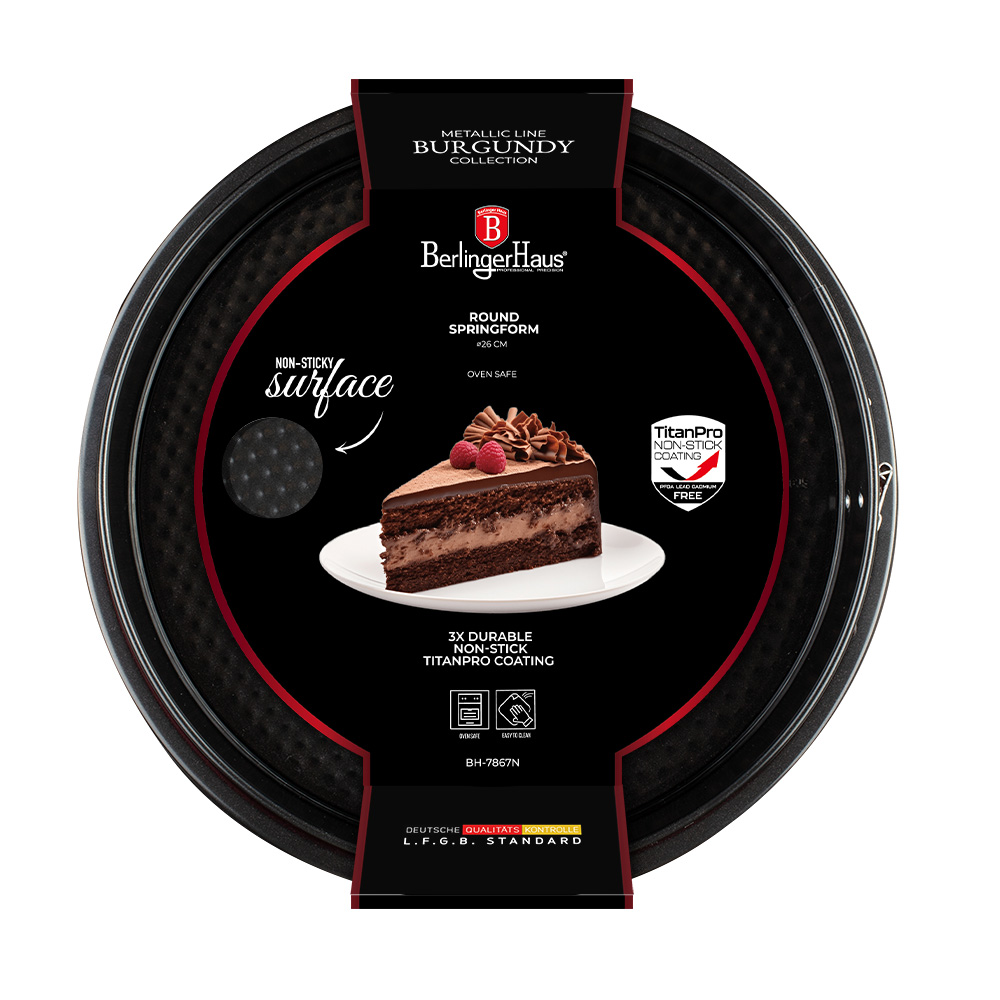 A burgundi színű, metál külsővel ellátott tortaforma elegáns megjelenést kölcsönöz, amely bármely konyhában megállja a helyét. A stílusos és funkcionális kialakításnak köszönhetően nemcsak a sütés, hanem a tálalás is élmény lesz.