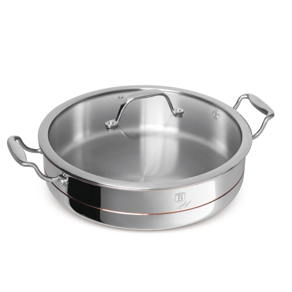 A Copper Touch Collection professzionális alacsony lábas fedővel (3,8 L) sokoldalú választás azok számára, akik egy jól kihasználható, széles főzőfelületű edényt keresnek professzionális minőségben. Az alacsony kialakítás ideálissá teszi az edényt pirításhoz, pároláshoz és olyan ételekhez, ahol fontos a nagy felület és az egyenletes hőelosztás. A rozsdamentes acél felületet elegáns réz csík egészíti ki, amely a Copper Touch Collectionre jellemző prémium, időtálló megjelenést biztosít.